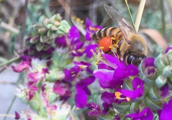 Honeybee shows off his pollen basket while working on Purple Dahlea, also known as purple prairie clover. Photo by Monika Maeckle