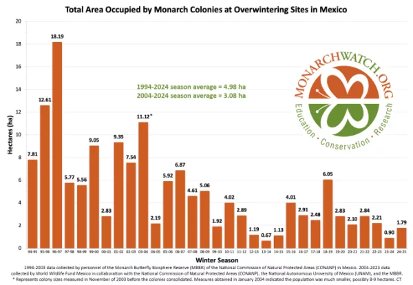 The eastern monarch butterfly population is typically calculated by counting the number of hectares the butterflies occupy in the overwintering roosts in the mountains west of Mexico City. This year, the count tallied 1.79 hectares, or about 4.42 acres.