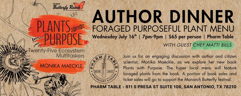 Learn more about Passionflower and other edible plants with purpose at our Author Dinner July 16 at Pharm Table in San Antonio. I’ll be talking with guests about my book, Plants with Purpose: Twenty-five Ecosystem Multitaskers (including Passionflower!), and guest Chef Matti Bills, owner operator at Howdy Child in San Antonio and Three Six General in San Marcos, will assemble an amazing dinner of foraged and locally farmed foods. Partial proceeds to benefit San Antonio’s Monarch Butterfly and Pollinator Festival, which celebrates its 10th birthday this year.