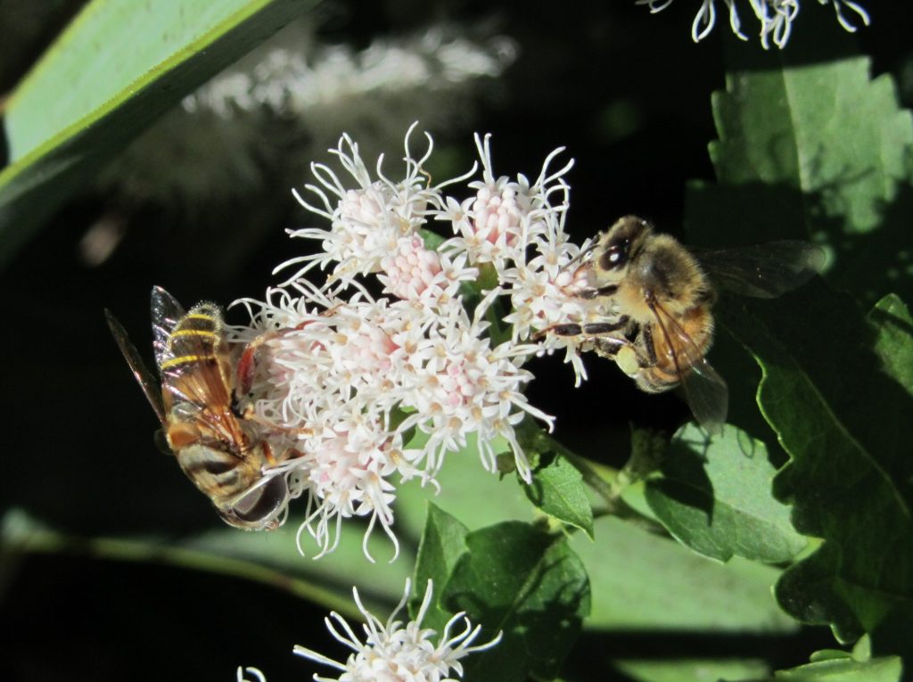 Honeybees work over the fuzzy blossoms of Shrubby boneset. –Photo by Joan Miller