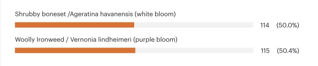 The race ran neck-and-neck the entire two-week voting period with the two contenders trading the lead daily. But after 229 votes, the drought tolerant purple bloomer in the Aster family pulled ahead of its white flowering counterpart in the final days of the contest. The final tally: Woolly ironweed 115 votes, Shrubby boneset 114.