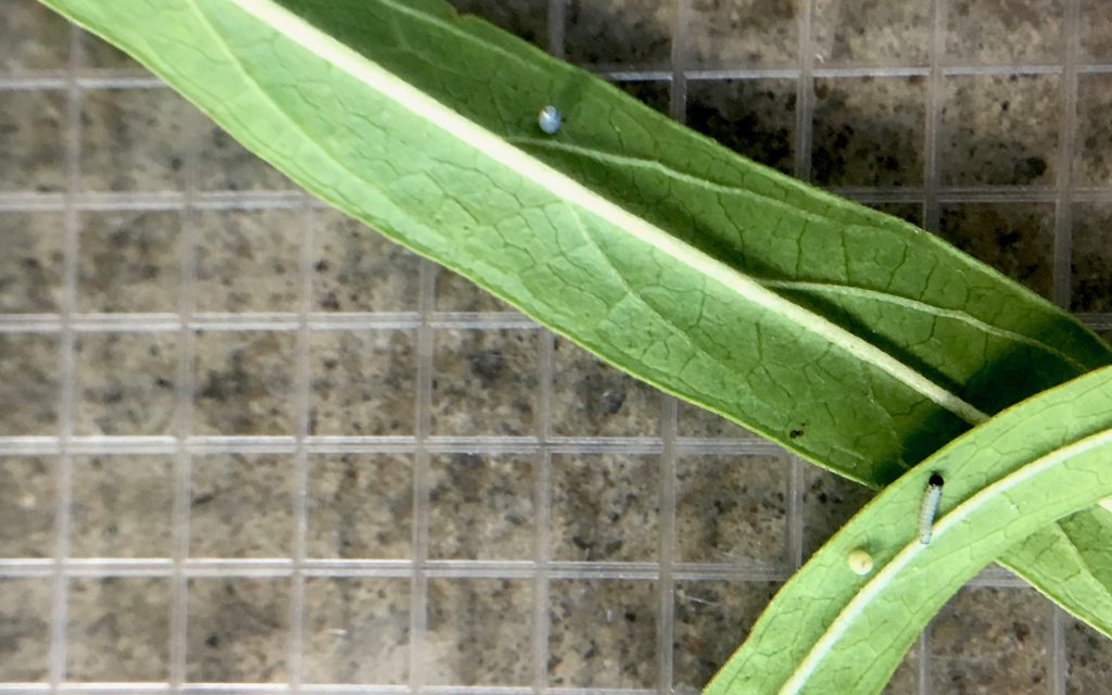 Eggs and first instar monarch caterpillars on milkweed. –Photo by Monika Maeckle