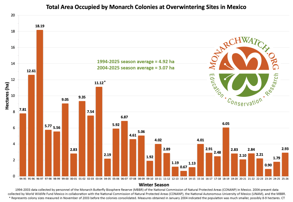 Using the 21.1 million metric, this year’s eastern population of migrating monarchs tallies about 61.8 million. The peak count since records have been kept occurred in the 1996-1997 season with 18.1 hectares, which using current metrics would have totaled more than 380 million.