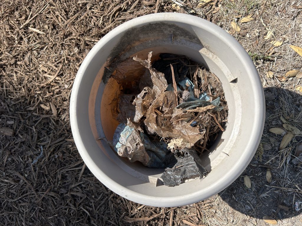 Turns out our native Texas tree mulch included bonus ingredients. Plastic, aluminum, zip ties, even a piece of electrical cord occupied the mound, as did other unnatural detritus. Surprisingly, the trash in this mulch was much more ubiquitous than what I had bought from the City.