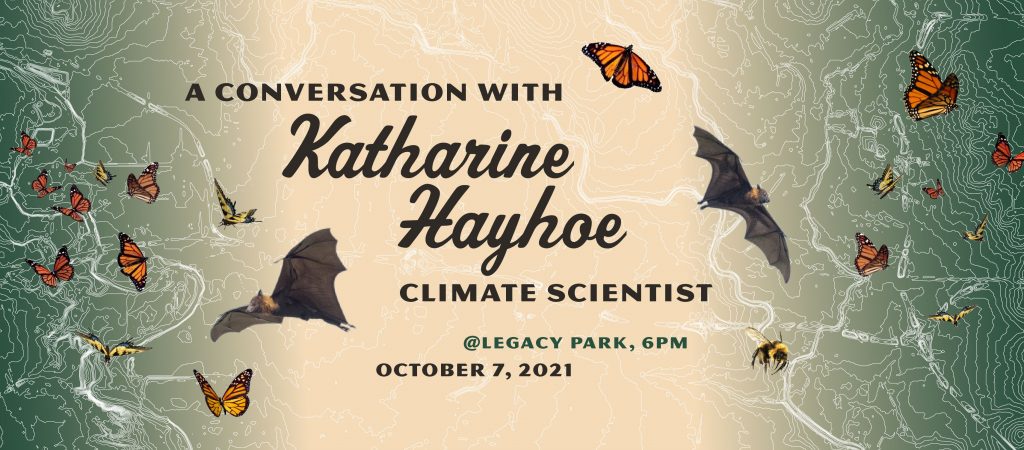 Save the date for this hybrid event, A Conversation with Katharine Hayhoe, Climate Scientist, streamed and projected onto a large screen at Legacy Park.